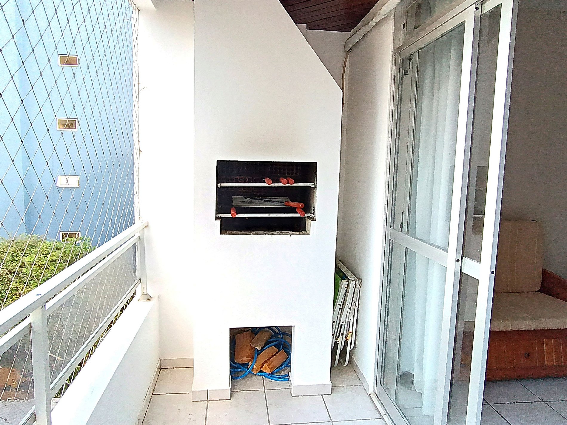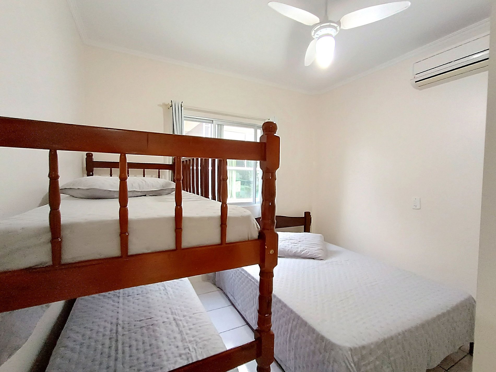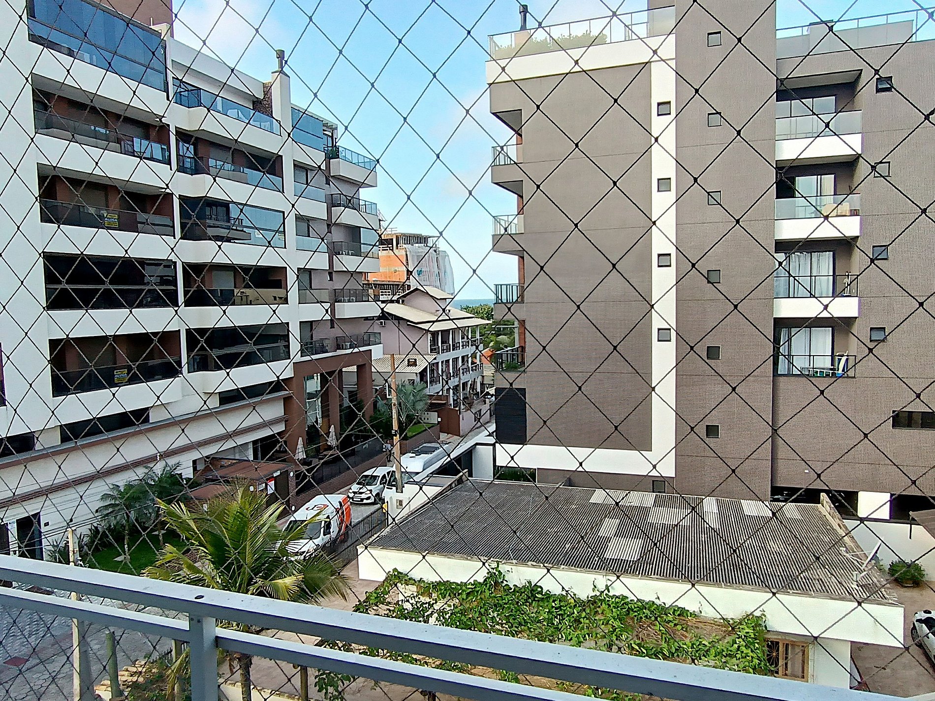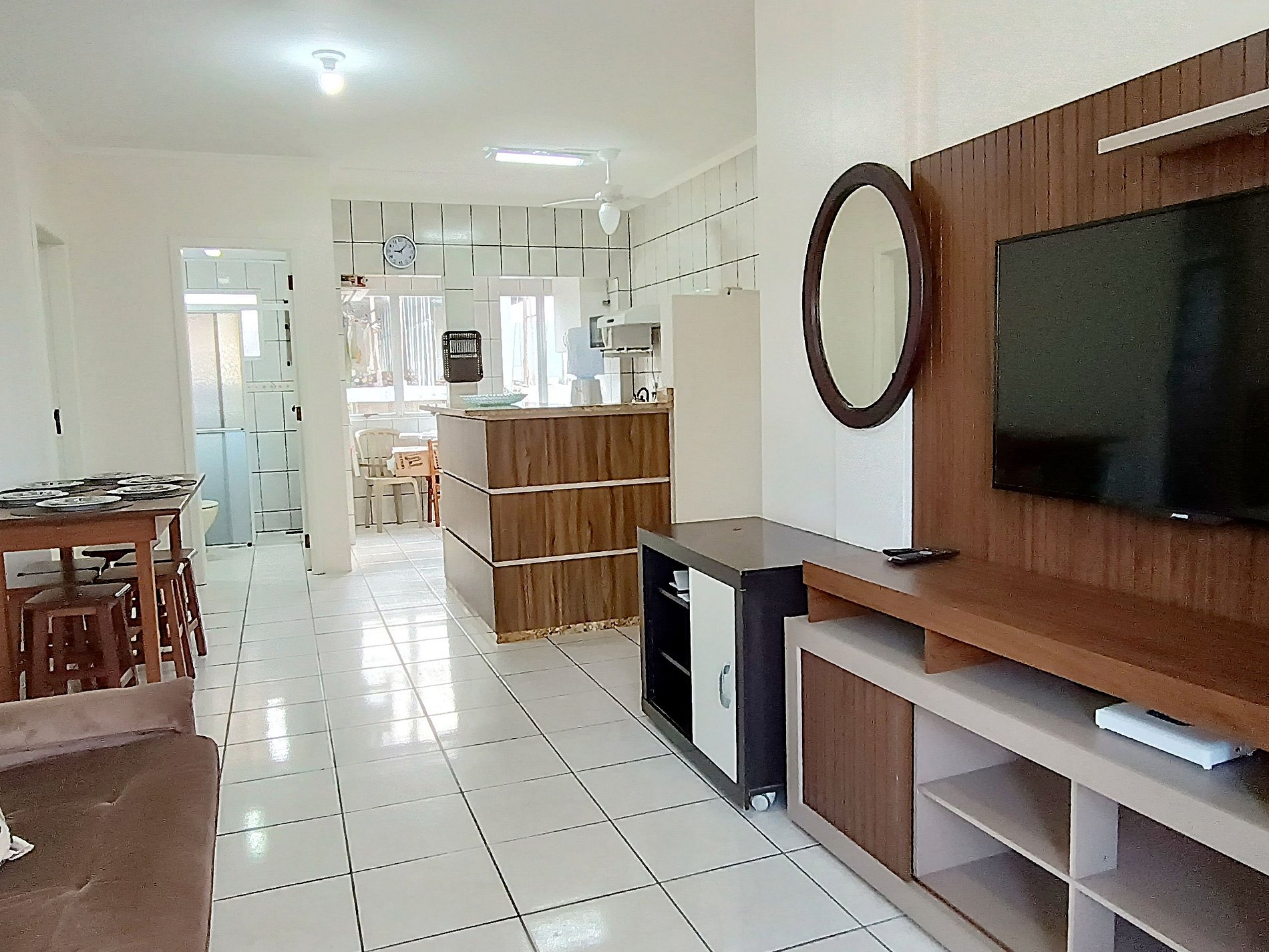 Amplio departamento con balcón con asador y pequeña vista al mar, acomoda hasta 8 personas incluyendo niños, posee 2 dormitorios, siendo uno en suite con cama matrimonial y un sofá cama, y en el otro dormitorio tiene una cama matrimonial y una cucheta, los dormitorios tienen aire acondicionado, el inmueble tiene cocina completa con mesa con 8 sillas, living y un baño social.