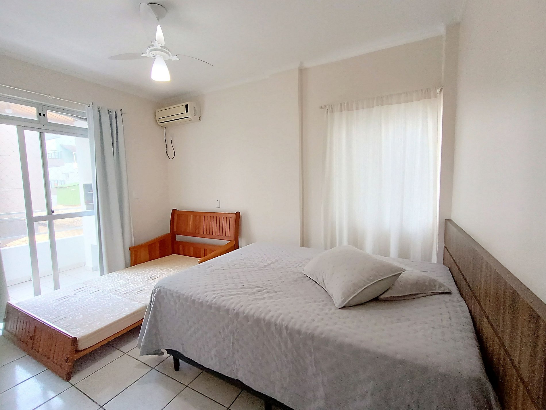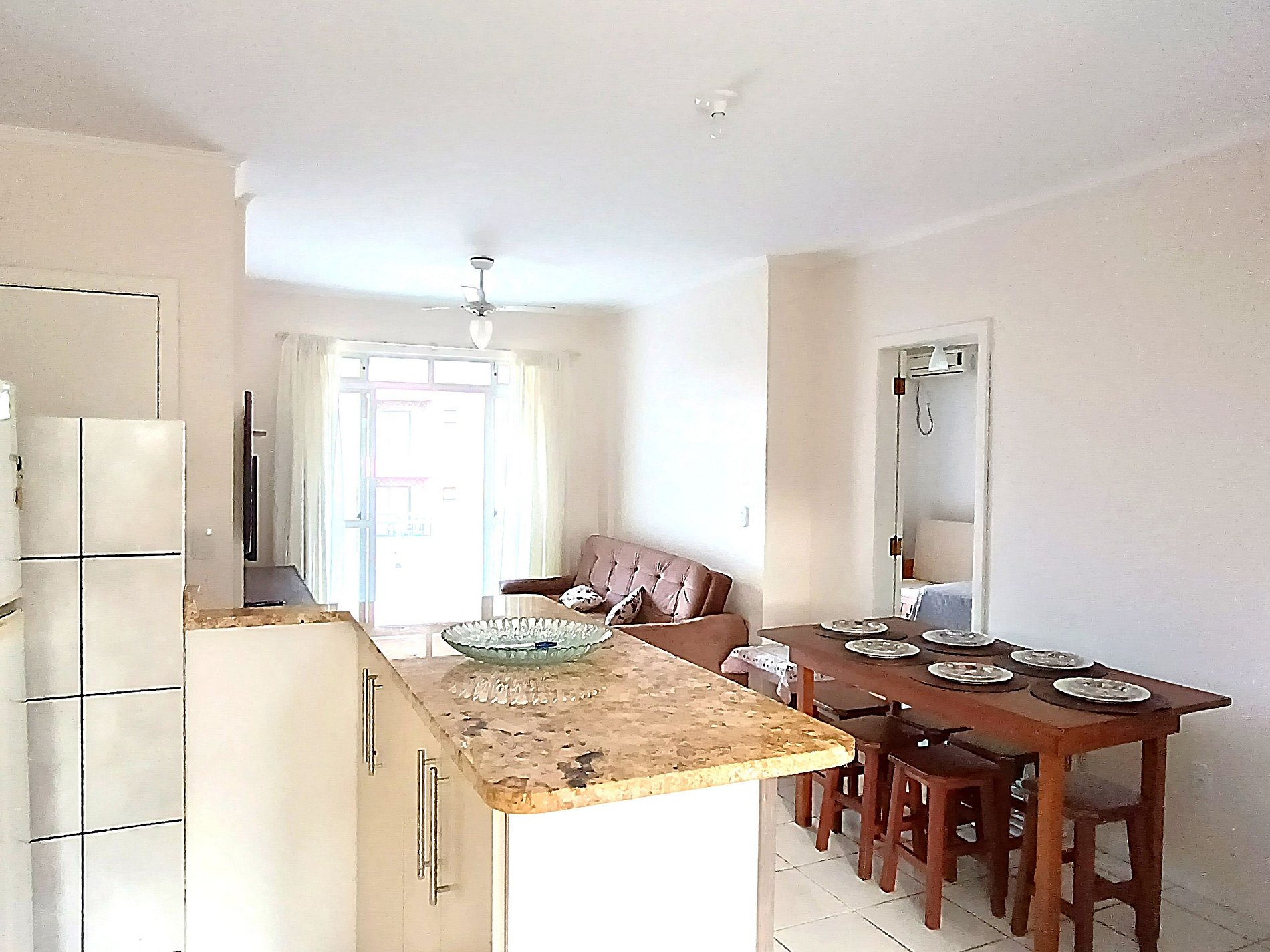 Amplio departamento con balcón con asador y pequeña vista al mar, acomoda hasta 8 personas incluyendo niños, posee 2 dormitorios, siendo uno en suite con cama matrimonial y un sofá cama, y en el otro dormitorio tiene una cama matrimonial y una cucheta, los dormitorios tienen aire acondicionado, el inmueble tiene cocina completa con mesa con 8 sillas, living y un baño social.