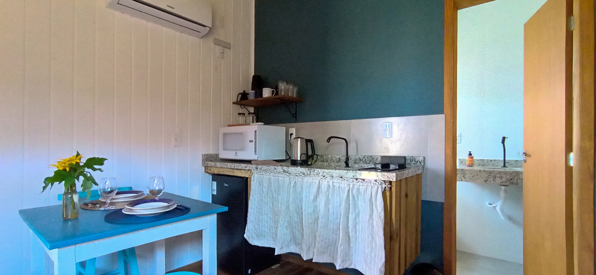 Confortables Monoambientes finamente decorados con baño privado, mesa y cocina compacta con microondas y frigobar (93Lts), mesa, pava electrica y sandwichera, Cafetera, Licuadora, Smart TV..