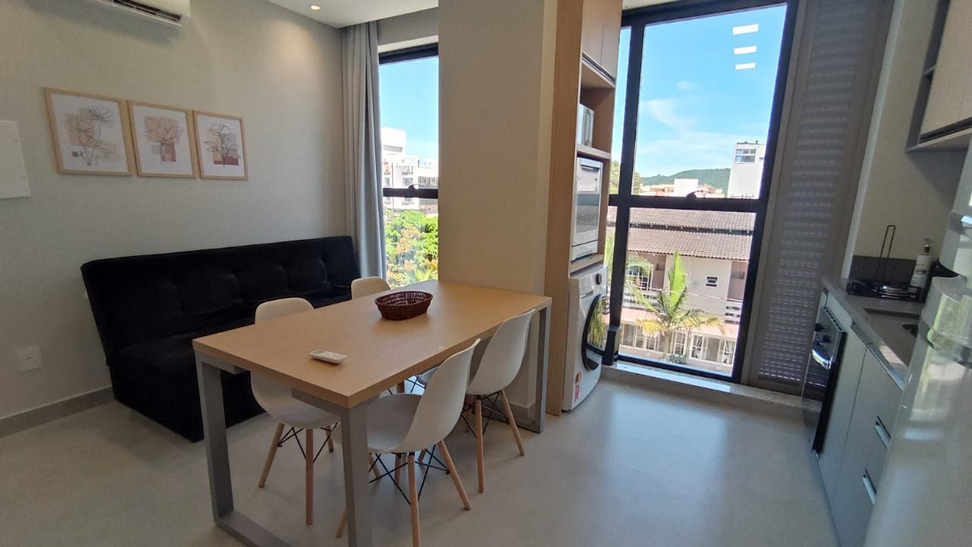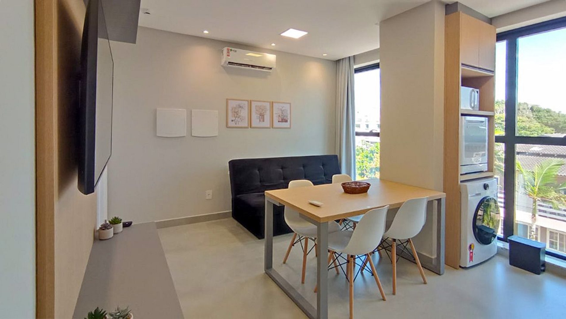 Apartamento de um quarto com cama de casal mais beliche, banheiro completo e sala integrada com cozinha compacta, mesa com 4 cadeiras, sofá cama de solteiro e Smart TV 50".