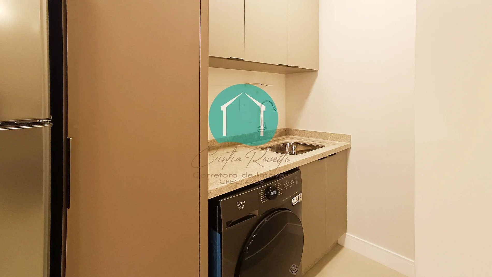 Lavanderia com máquina de lavar integrada à cozinha.